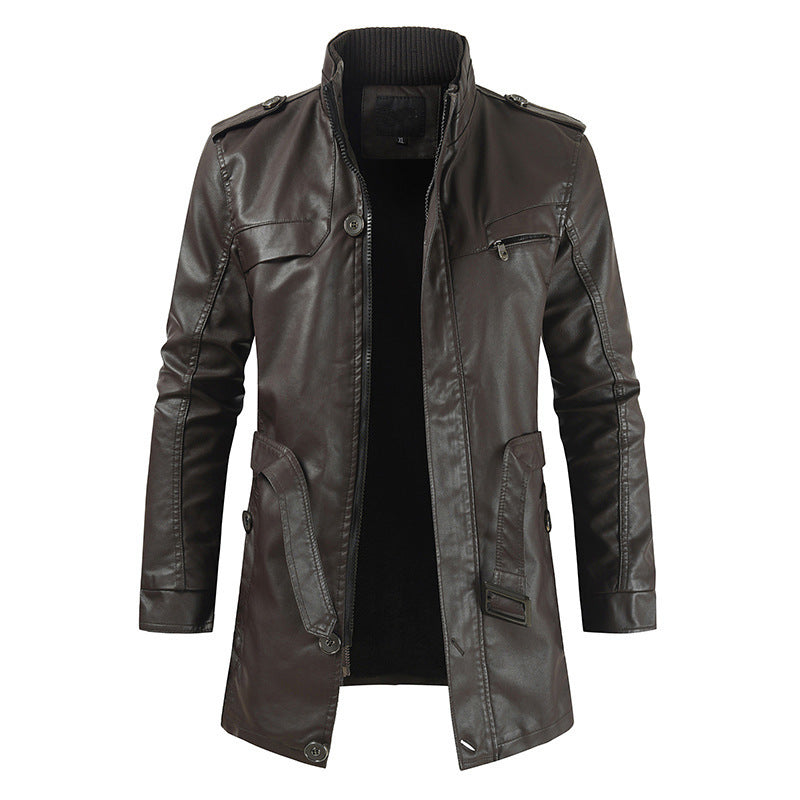 Men's Mid-length Fleece-lined Casual Stand Collar Leather Wind Coat