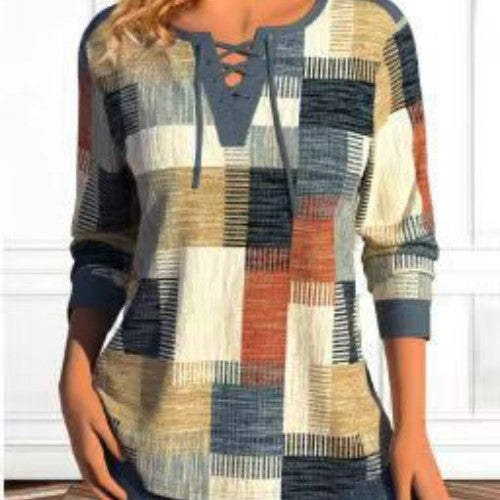 Printed Contrast Color V-neck Long Sleeve T-shirt