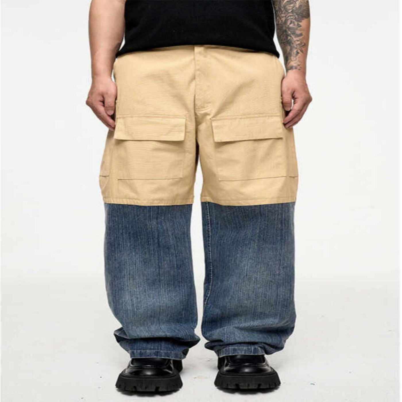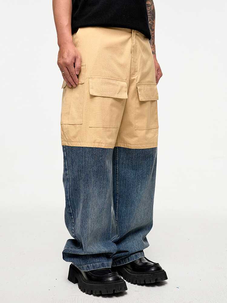 Retro Multi-pocket Stitching Denim Contrast Color Loose Straight Casual Pants